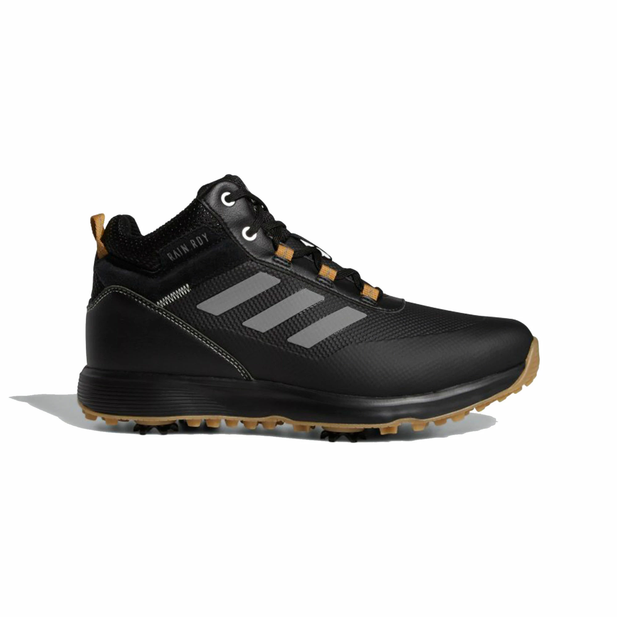 adidas S2G Mid Cut Golf Boots – Black/Grey The S2G mid cut golf boots are a pair of waterproof adidas golf shoes that provide incredible waterproof protection while on the golf course while also offering brilliant grip and traction while playing.& These golf shoes have been designed using RAIN.DRY technology from adidas to ensure that when golfers are playing on a golf course that has wetter turf or is experiencing a downpour of rain your feet will remain cool and dry.& To ensure that while wearing these adidas golf shoes in wetter conditions that golfers will still have plenty of stability and traction to be able to play a great round of golf, these boots have been constructed using a rubber V-Traxion outsole that features thintech cleats to make sure that there is more than enough grip with the turf to allow for a much more smooth golf swing. adidas has also made sure these are wide fit golf shoes so that there is much more stability while playing.& As part of their ambition to help end plastic waste these adidas golf shoes have been constructed using at least 50% recycled materials to provide a much more sustainable option. Features Waterproof Four-cleat Adiwear rubber outsole Lace closure Textile lining Rubber V-Traxion outsole with Thintech cleats Wide fit