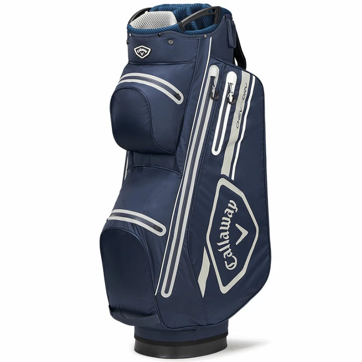 Callaway Chev Dry 14 Waterproof Cart Golf Bag The Callaway Chev Dry 14 cart golf bag uses a 14 way top to help keep your clubs organised and easily accessible on the course, while also being made of a waterproof material that will be able to withstand any condition that you decide to play in. Callaway has designed this golf bag to feature a 14-way top for excellent organisation and storage of golf clubs so that golfers can get to exactly the club they need quickly and easily. This top also includes an integrated putter well for added convenience.& This golf bag is also packed with pockets for players to have more than enough storage space for their valuables, GPS, balls and clothing to be stored safely and securely, as well as a large apparel pocket that is perfect for storing waterproof jackets, jumpers and other golfing waterproofs.& Designed to be easy to use this golf cart bag is suitable to be used on a wide range of golf trolleys so that golfers can always bring this bag with them to the course. Features& 14-way top with integrated putter well TPR strap bite Large apparel pocket Ball pocket GPS pocket Valuables pocket Towel Rope