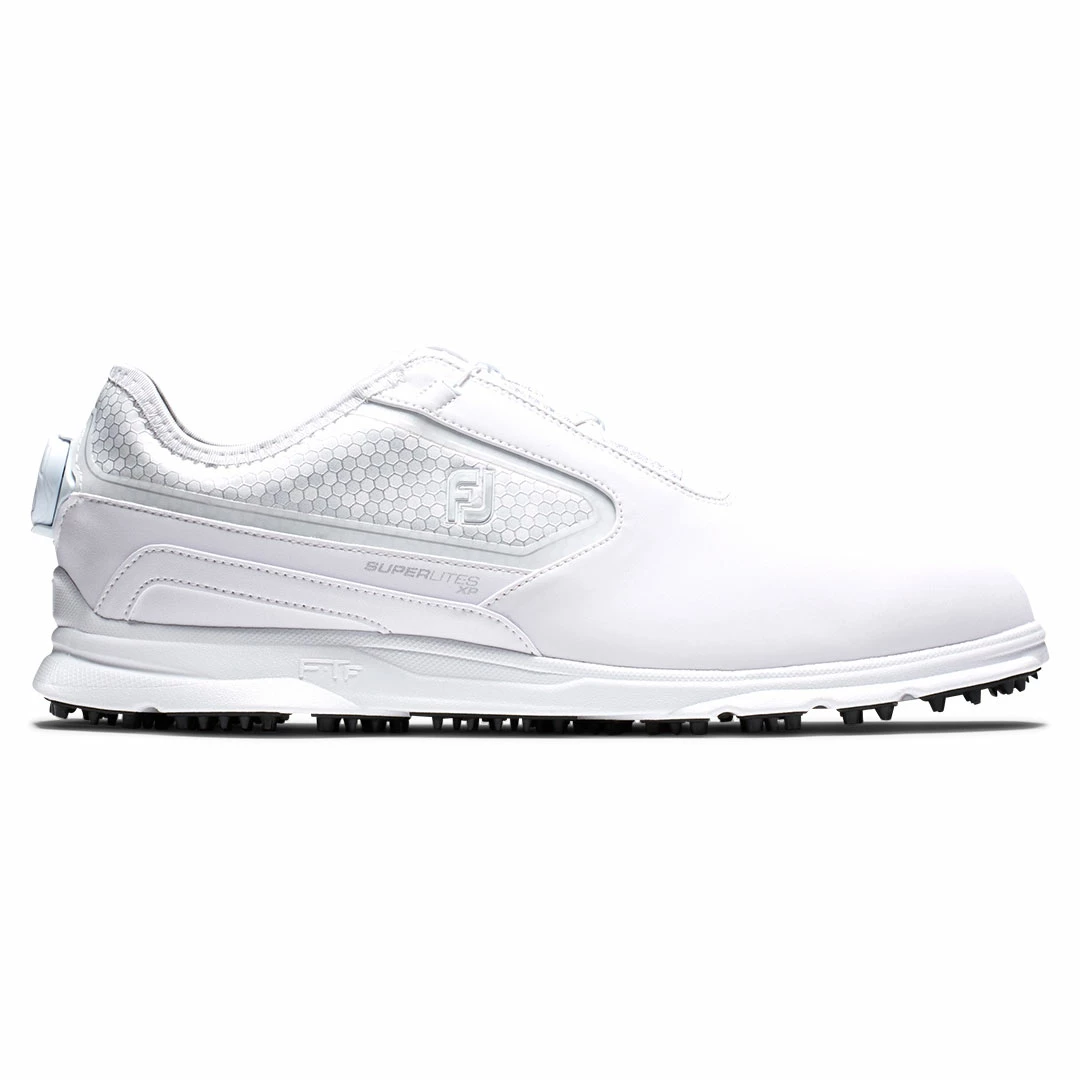 FootJoy SuperLites XP BOA Golf Shoes Offering incredible lightweight athletic performance the SuperLites XP BOA are the perfect pair of summer shoes for the golf course which offer flexibility and protection from sudden wetter conditions. Though the SuperLites XP BOA& are a lightweight option, they still offer amazing levels of comfort and durability.& Built using a standard construction, the shoes also include a mesh liner inside that provides wearers a feel and fit that is similar to that of wearing another soft pair of socks. A pull tab has also been placed on the heel for added convenience when getting the right placement inside the shoes/& And even though these golf shoes are the perfect pair for summer weather, they are also waterproof and offer easy care synthetic uppers to provide even more comfort but also increased durability.& The soft molded rubber traction elements that are used on these shoes ensure a slip free round of golf with excellent turf gripping traction. This has been paired with the full rounded toe character that features a standard fit across the forefoot and instep. A toe spring and slightly narrow heel helps to complete the overall athletic profile of these golf shoes. Tuned for precision the SuperLites Boa offers effortless precision so you can play all day with confidence. The micro-adjustable BOA Fit System dials in your accuracy for a game that’s consistent and precise. Features and Benefits DURABLE CONSTRUCTION Waterproof, easy care synthetic uppers provide a comfortable fit and added durability. LASER SPORT FIT Offers a full rounded toe character with a standard fit across the forefoot and instep. A toe spring and a slightly narrow heel completes the athletic profile. EXTREME COMFORT Built using standard construction with a mesh liner which provides a sock-like feel and fit. An added pull tab is placed on the heel for added convenience. TURF GRIPPING ADVANTAGE Soft molded rubber traction elements ensure a slip free round with turf gripping traction.