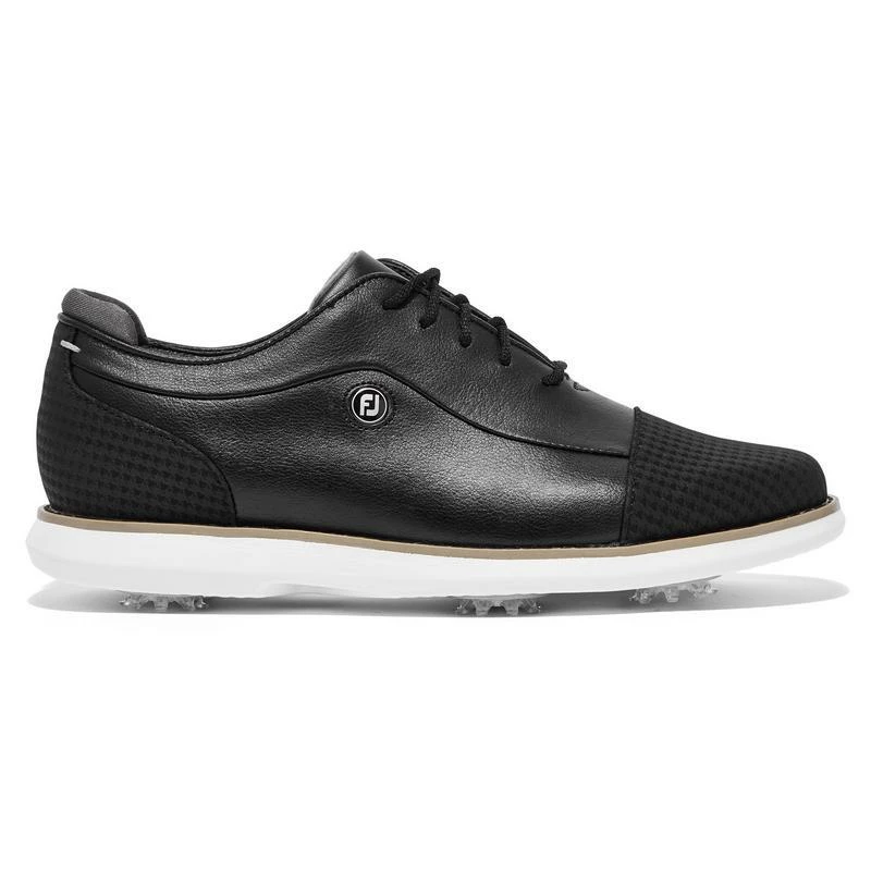 FootJoy Traditions Women Golf Shoe The FootJoy Traditions Women Golf Shoe offers a clean, iconic silhouette that provides complete traction and can be easily maintained round after round. The shoes are designed with super-cushioned foam underfoot that will make sure that while you play you remain comfortable and supported through the entire round. The shoes also feature a& built-in achilles pad which ensures a perfect no-slip fit every time.& The Traditions uses Pulsare LP cleats by Softspikes for renewable grip on the golf course. And for further support on the course, these shoes come with a 1 year waterproof warranty thanks to the performance synthetic leather that has been used that provides a soft and easy to clean upper. These shoes are available in white and white/blue. Feature and Benefits ALL DAY COMFORT The super-cushioned foam underfoot will keep you comfortable and supported throughout the entire round, and a built in achilles pad ensures a perfect no-slip fit. 100% WATERPROOF 1-YEAR WATERPROOF WARRANTY – Performance synthetic leather provides a soft and easy to clean upper with 1 year waterproof protection. TRACTION DELIVERED Pulsar LP cleats by Softspikes for renewable grip on the course. & &