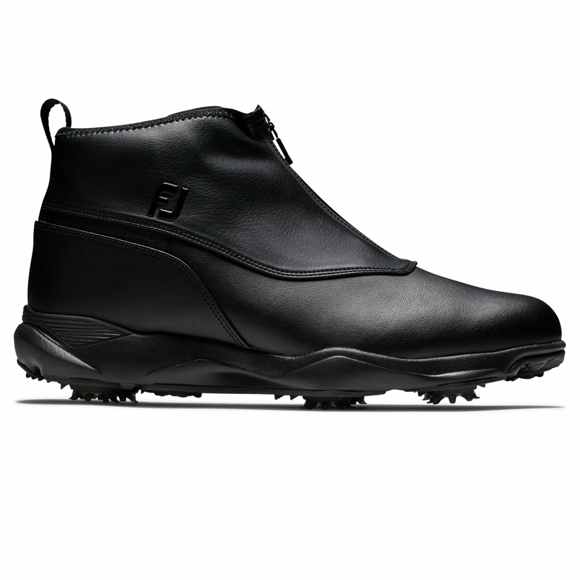 FootJoy Winter Shroud Golf Boots FootJoy has created the Winter Shroud Golf Boots to provide golfers with stylish pair of golf shoes that will look brilliant on the golf course this winter, while also ensuring you are able to play with all of the mobility and stability needed while also offering great protection form the elements.& The Shroud Golf Boots have been constructed using a soft full grain leather with a half body zip to create a pair of FootJoy golf boots that look sleek and stylish while also being incredibly easy to get on and off. This leather construction also offerings great protection in wet weather conditions by offering waterproof performance.& By using a waterproof design golfers will be able to continue playing golf in the rain without the risk of their feet becoming cold and wet. This has then been paired with a thermal lining inside the shoe which provides brilliant warmth and is perfect for use during the colder winter months. To make sure that you can play with brilliant traction and grip while on the golf course, these FootJoy boots have been constructed using a renewable traction system which features Softspikes® Pulsar cleats. These golf shoe cleats ensure you are able to play with greater stability so that every shot can be played perfectly. Features Soft full grain leather with thermal lining Renewable traction with Softspikes® Pulsar cleats 1 year waterproof warranty