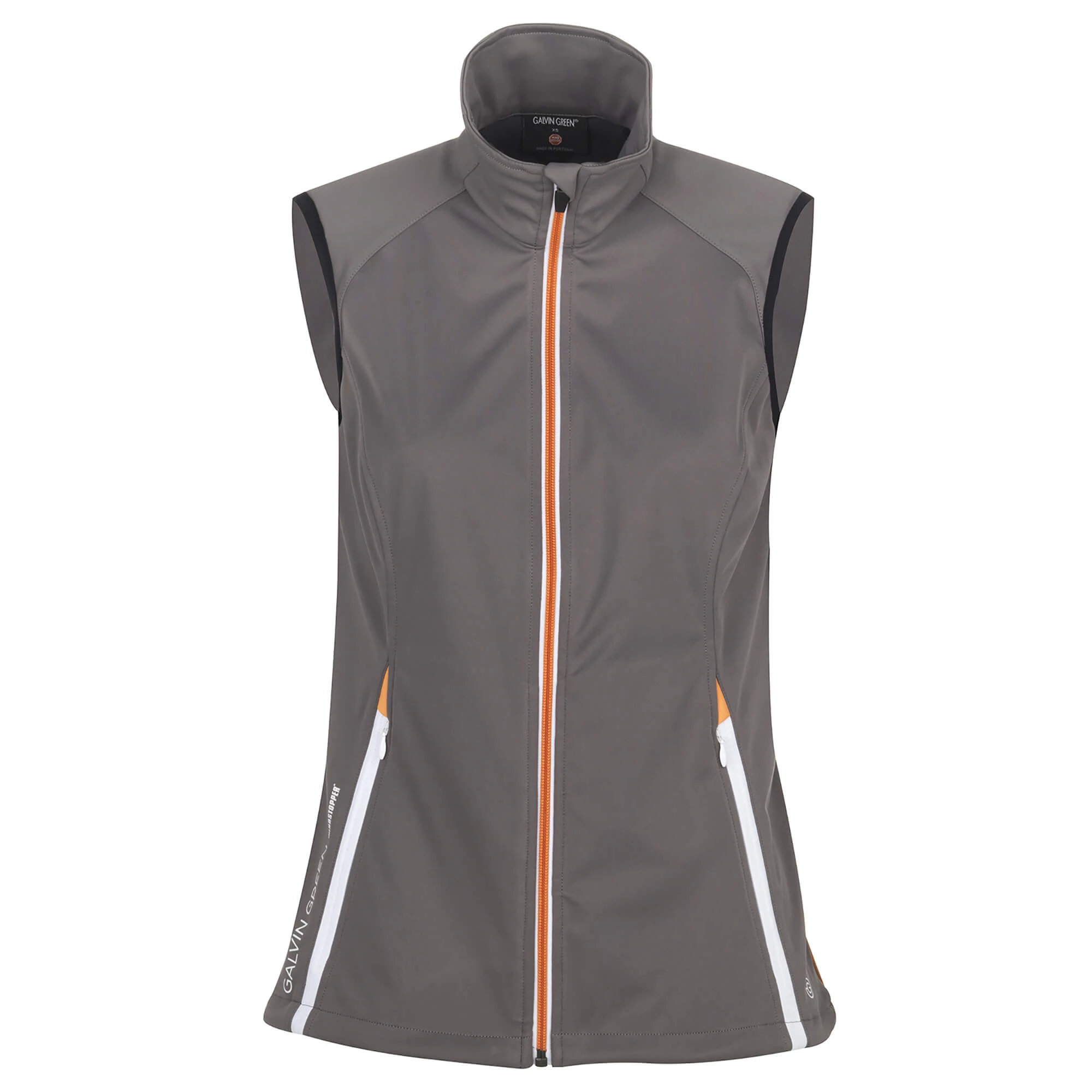 Galvin Green Bree Full Zip Windstopper Body Warmer Windproof full zip body warmer in lightweight WINDSTOPPER® Soft Shell fabric. A very light, flexible and quite garment with excellent breathability and comfort. Feminine cut with a subtle design. The body warmer has a full length zip, two front pockets with concealed zippers, and adjustable bottom edge. Totally windproof. Effectively protects against windchill. Maximum breathability that allows moisture vapour to evaporate. Thermoregulatory function keeps the body at an optimum performance temperature. Perfect fit for maximum comfort and freedom of movement, specially developed for golfers. Easy to wash and maintain, just regular machine wash.