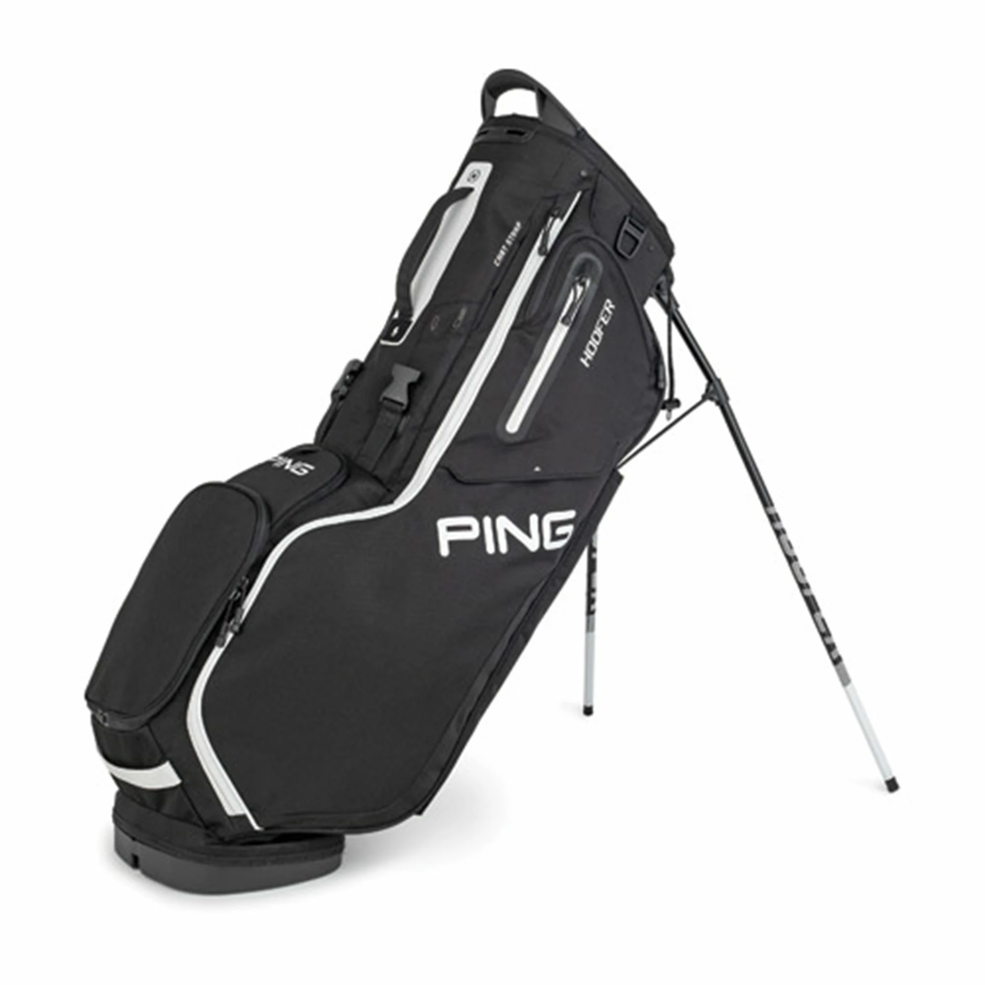 Ping Hoofer Golf Stand Bag – Black The Ping Hoofer Golf Stand Bag allows golfers to own a bag that pairs premium styling with quality construction, as well as plenty of storage for everything you will ever need on the golf course.& A 5-way divider top has been used in the design of this golf clubs bag so that golfers can store their golf clubs in a much more organised way that makes it easier to get to the club they need in pressure situations.& This golf stand bag has been constructed to only weigh 2.5kgs, making it incredibly lightweight and easy to carry around a golf course for a full 18 holes. To make this bag even easier to carry Ping has included a convertible shoulder strap which can be used as either a single or double strap for added stability while walking. This has been paired with a cushioned hip pad that makes it much more comfortable to carry this golf bag. Ping has incorporated 11 pockets into the design of this stand bag which includes plenty of room to store valuables, accessories and water bottles so that you always have access to a cool drink during a long day of summer golf. Also included in this golf bag is a large apparel pocket for storing golf clothing, including golfing waterproofs, golf body warmer and waterproof golf trousers for men so that you are always prepared for every weather condition on the golf course. To ensure that this golf bag can be used in poor weather conditions Ping has included a rain hood to protect the golf clubs and items stored in this bag, while an umbrella holder has been installed so that players can quickly access your golf umbrellas to remain dry. Features 5 Way Divider Top Adjustable Shoulder Straps Flexible Strap Connector Convertible Shoulder Strap – Double to Single Cushioned Hip Pad Cart Strap Channel For Use On A Trolley 11 Pockets In Total Clothing Pocket Valuables Pocket Magnetic Pocket Ball & Accessory Pockets Water Bottle Pocket Rain Hood Umbrella Holder & Towel loop Weight Of 2.5KG