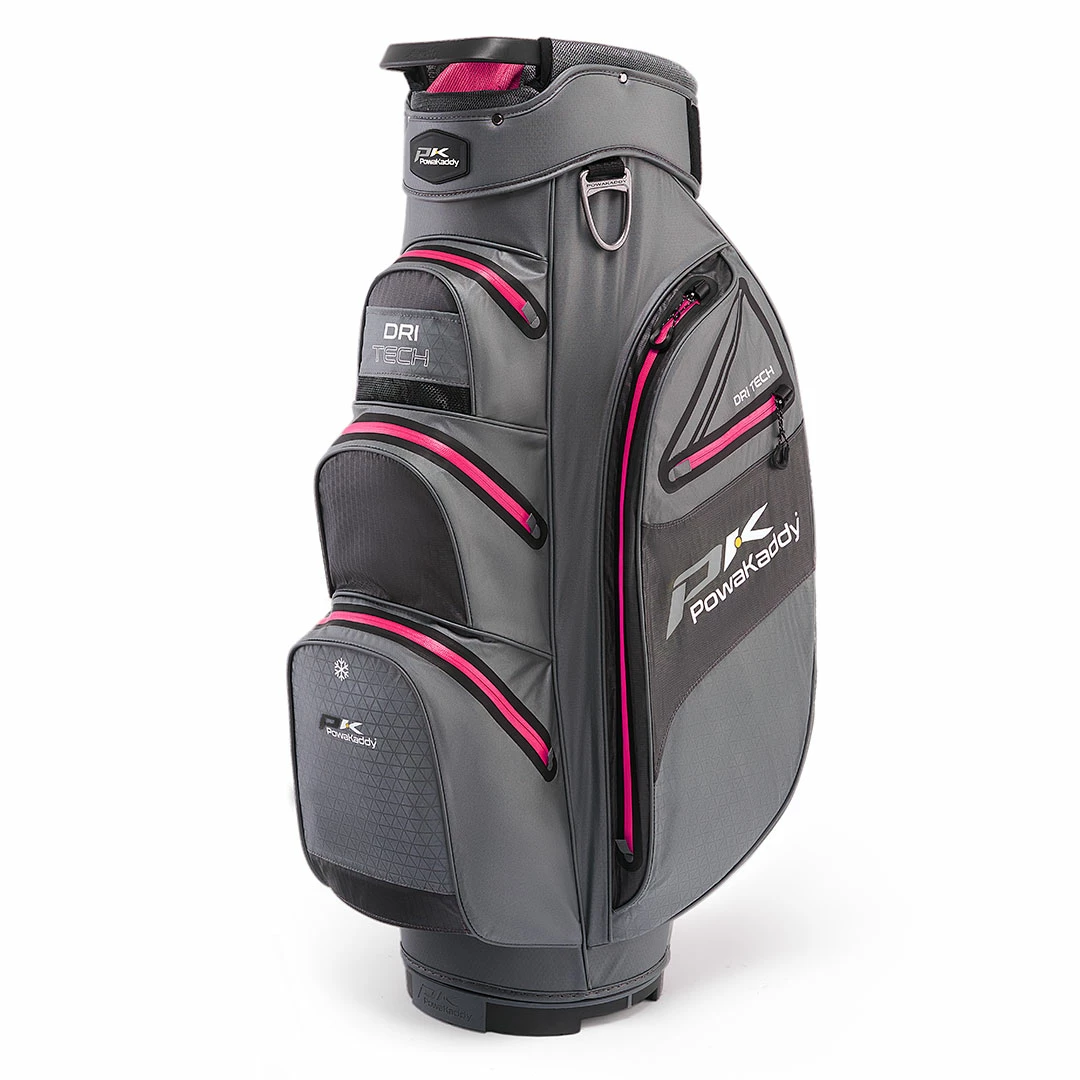 PowaKaddy Dri-Tech Waterproof Golf Cart Bag PowaKaddy has created the Dri-Tech Waterproof Golf Cart Bag for golfers who want to be able to continue playing a round of golf in whatever weather they have to face, while still having a golf bag that offers brilliant golf club organisation and storage too.& This golf cart bag has been constructed to provide golfers with a golf bag that can be used in even the worst weather conditions, with a waterproof rating of 10,000mm which is able to withstand heavy rain conditions to keep whatever is stored inside bone dry. This waterproof golf bag offers even more protection thanks to the heat-sealed waterproof fabric that has been used.& To ensure that golfers are able to store their golf clubs in a much more organised way, PowaKaddy has included a 14-way divider top which features an oversized integrated putter bay. Allowing each golf club to have its own individual storage slot means ensures that golfers can get to the golf clubs they need easily without any mix-ups.& PowaKaddy has included 7 storage pockets in the design of this golf bag so that golfers can bring everything they need with them to have a great round of golf. These pockets include a velour-lined valuables storage pocket, an insulated cooler pocket to enjoy cold drinks during warmer days, and two large golf clothing pockets. These pockets are perfect for storing golf jumpers, waterproof golf jackets, golf trousers and other golf clothing so that you are always prepared for any changes in weather conditions.& This golf trolley bag has been constructed using super-lightweight nylon which allows for the overall weight of this golf bag to only be 2.3kg. This lightweight design, paired with easily accessible carry handles means that this waterproof golf bag is incredibly easy to load on and off of a wide range of golf trolleys. When this golf cart bag is placed on a golf trolley it offers golfers a stable base for storing their golf clubs thanks to the PowaKaddy Key-Lock anti-twist system on the base which forces to keep this golf bag to be held in position for a much more stable ride.& PowaKaddy has also included an internal umbrella bay and rain hood with this golf bag so that golfers are able to quickly protect their golf clubs while also using a golf umbrella to stay dry themselves.& Features 10,000 hydrostatic rating heat sealed waterproof fabric Gives maximum protection against the elements 14 Individual dividers Gives excellent protection for your shafts whilst keeping your clubs organised. Divider top with oversized integrated putter bay The designated putter divider allows for oversized putter grips. Internal umbrella bay Easy and quick access to your umbrella during rain showers Covered Zip holders Tuck your zip in to ensure complete protection from the elements Scorecard holder Quick access to your scorecard 2 large apparel pockets Large storage space for your golfing apparel. Velour-lined valuables storage pocket Storage for your valuables Insulated cooler pocket Keep your drinks and food cool 7 storage pockets in total Plenty of pockets for all your golfing gear PowaKaddy Key-Lock™ anti twist system on the base Stops lateral movement of your bag when used with a PowaKaddy electric cart Towel holder Easily attach and remove your golf towel Anti-wear patch on rear of bag Stops any wear to the main bag when used over rough terrain Easily accessible carry handles Ideal for lifting from your car to your trolley Quick Release Strap Carry strap easily removed when not in use Rain Hood Keeps your clubs dry