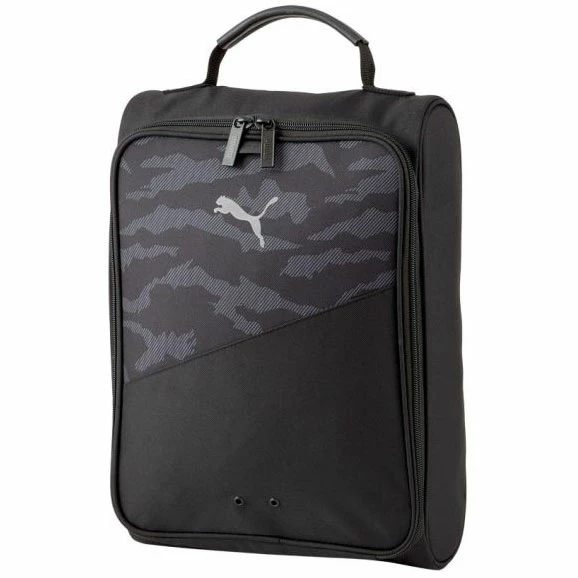 Puma Golf Shoe Bag Puma has created a golf shoe bag to make it easier than every to transport your favourite golf shoes to the local golf course without any risk of damage while travelling.& This shoe bag offers brilliant storage for your shoes, and includes an internal shoe divider to stop any movement or rubbing while being carried so that your golf shoes won’t become covered in mud by the sole touching the other shoes top.& To make it easier to get to your golf shoes Puma has included a U-shaped zippered opening to make for easy access. The Top grab handle that has been used in the design provides a comfortable feeling while carrying your shoes to the range.& Features Metal eyelets for further ventilation Top grab handle Internal shoe divider Camo graphic print