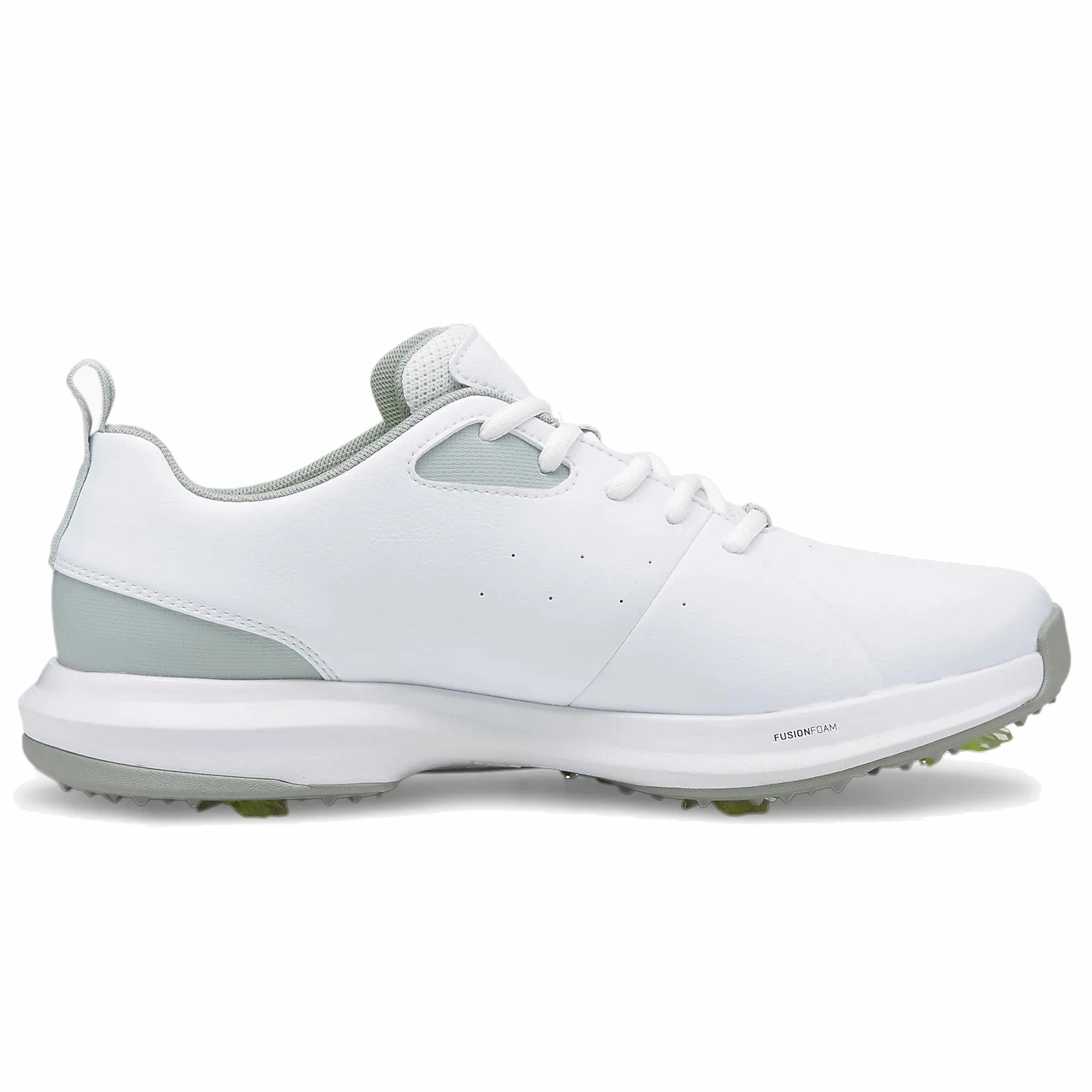 Puma FUSION FX Tech Golf Shoes Puma Golf has created the FUSION FX Tech Golf Shoes to provide golfers with a pair of waterproof shoes that offer incredible comfort out on the golf course while also having the grip and traction to easily be able to create brilliant performances on every shot.& These golf shoes have been designed to feature a cool and classic style that will look great at your local golf club while they also offer a clean silhouette when lining up a putt on the green. The low boot construction creates a sporty feel which has been paired with plenty of stability to ensure great shots can be created. To make sure that golfers can easily walk a full 18 hole golf course without any risk of aches and pains that is sometimes associated with spiked golf shoes, Puma Golf has designed these golf shoes to include a Fusion Foam cushioning for maximum comfort out on the golf course. The Fusion Foam has been designed using a combination of incredible soft EVA foam and amazingly responsive rubber which works together to create cushioning that offers brilliant foot support and comfort. For golfers who are looking for golf equipment that can be used all year round without having to worry about changing weather conditions, Puma designed these golf shoes to be fully waterproof. This has been achieved by using a microfiber upper that provides a clean wrapping around the top of a golfers foot. As well as this the microfibre upper offers brilliant waterproof protection in the rain and damp turf to help keep your feet dry and warm in the worst weather conditions.& Puma Golf has included 6 strategically placed cleats in key areas around the base of this golf shoe to ensure you have all the traction and stability you need on the golf course to create brilliant golf swings with greater accuracy and power. Features Microfiber Upper The microfiber upper wraps the foot comfortably while being fully waterproof. Fusion Foam A mix of super soft EVA foam and ultra-responsive rubber that combines to provide unrivalled cushioning and an ultra-plush ride. 6-Cleat Design The outsole of these golf shoes feature 6 strategically placed lugs in key areas to deliver traction and stability on course. &