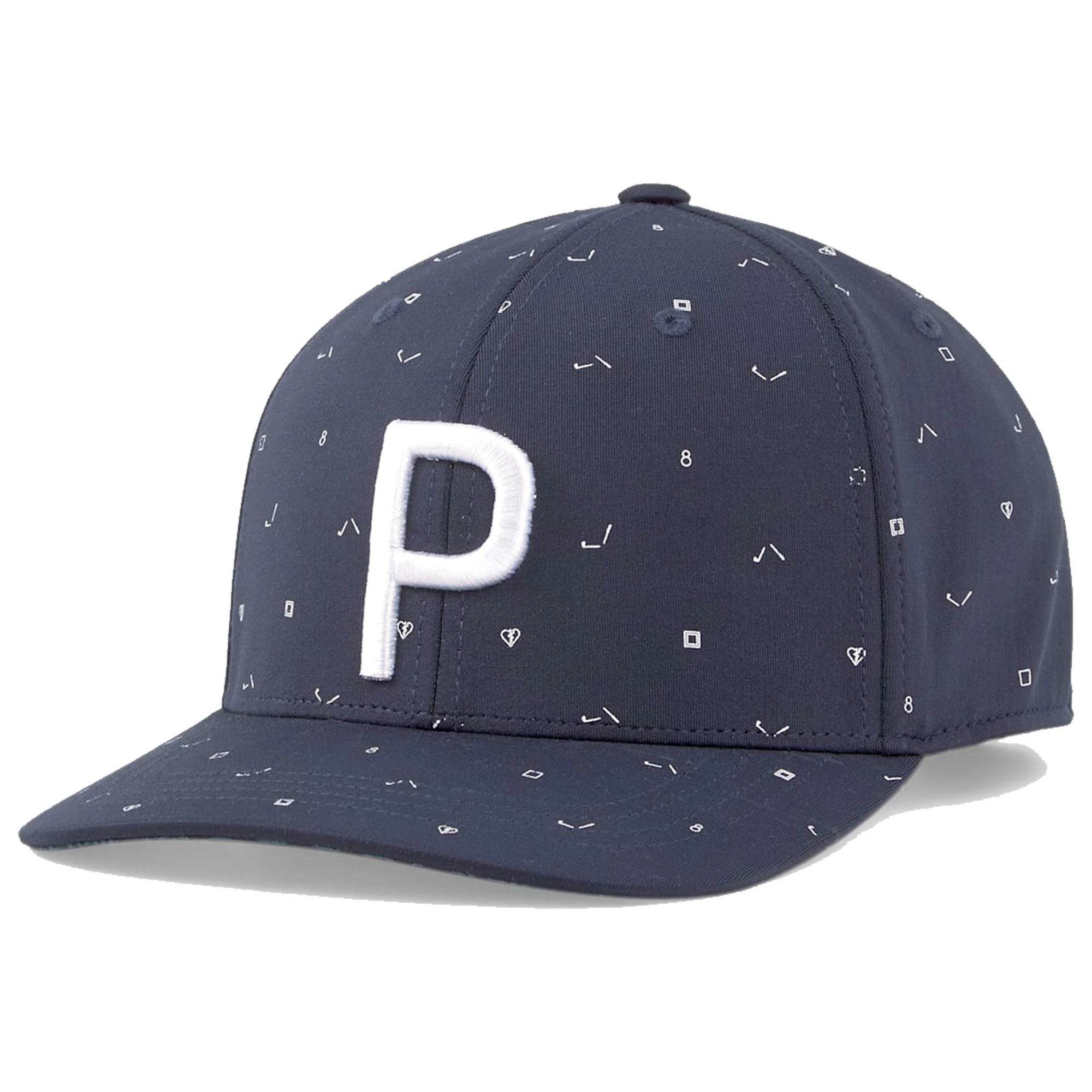 Puma H8 Golf P Snapback Golf Cap Puma has created the H8 Golf P Snapback Golf Cap so that golfers are able to step out onto the golf course with an adjustable snapback that fits perfectly and provides brilliant protection from the sun.& This golf hat has been constructed to feature a slightly curved brim for excellent protection from distracting rays of sun, while also featuring a moisture-wicking that works to help keep you cool while playing.& The 3D embroidered P logo with a flat embroidered outline makes this golf cap look great both on and off the golf course.& Features 110 Flexfit snapback cap with slightly curved brim and adjustable fit Embroidered eyelets Moisture-wicking sweatband 3D embroidered "P" logo at front PUMA Cat Logo at back &